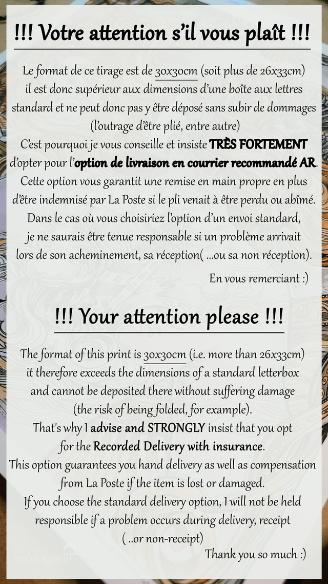 -!! ATTENTION !! - Le format de ce tirage est de 30x30cm (soit plus de 26x33cm) il est donc supérieur aux dimensions d’une boîte aux lettres